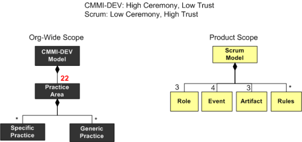 Unlike the “practice” dominated CMMI-DEV model, the Scrum model elements are diverse. Scrum’s first class citizens are roles (people!), events, artifacts, and the rules of the game that integrate these elements into a coherent socio-technical system. In Scrum, as long as the rules of the game are satisfied, no practice is off limits for inclusion into the framework. However, the genius inclusion of time limits for each of Scrum’s 4 event types implicitly discourages heavyweight practices from being adopted by Scrum implementers and practitioners.