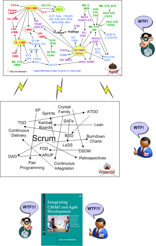 To BD00, the agile movement, even though it is a refreshing backlash against the “Process Models And Standards Quagmire” (PMASQ) perpetrated by a well-meaning but clueless mix of government and academic borgs who don’t have to create and build anything, has spawned its own quagmire of “Agile Process Frameworks And Practices Quagmire” (APFAPQ). Like the PMASQ community has ignited a cottage industry of expensive consultants, certifiers, assessors, trainers, and auditors, the APFAPQ movement has jump-started an equivalent community of expensive consultants, coaches, trainers, certifiers.