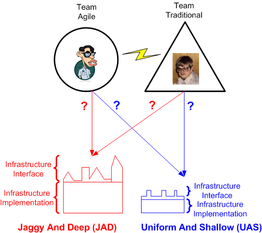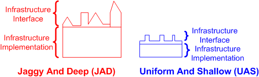 Assume that the figure below faithfully represents two platform infrastructures developed by two different teams for the same application domain. Secondly, assume that both the JAD and UAS designs provide the exact same functionality to their developer users. Thirdly, assume that the JAD design was more expensive to develop (relative depth) and is more frustrating for developers to use (relative jaggy-ness) than the UAS design.