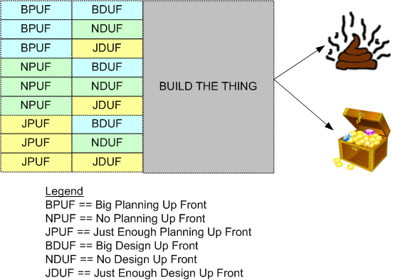 Assume (which is a bad thing to do) that you can characterize a project by three activities: Planning, Designing, and Building. Next, assume (which is still a bad thing to do) that the planning and designing activities can each be sub-characterized by “Big“, “No“, and “Just Enough“.