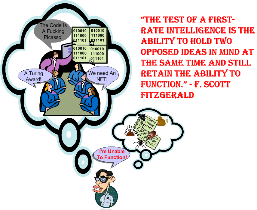 While coding away on problems, I was always thinking in the background about what I could do to help future maintainers understand the code ASAP so they could get something done without getting frustratingly stuck. I’m embarrassed and sad to admit it, but it was more of a classic, fear-based, ego-driven mission than an altruistic one. I was afraid of feeling like schitt whenever I envisioned colleagues reading my code. I yearned for everyone who read the code to say “Wow, I wish I knew this maestro!“, instead of “WTF!” after every few lines.