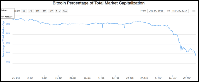 Meanwhile, the Bitcoin network is becoming more exponentially saturated as new users (Venezuela, Mexico, Greece, Cypress, China, Japan, Africa, India) try flocking to Bitcoin to use as cash but are turned back by wildly rising transaction fees and confirmation times – a massive decrease in usability to large swaths of people. The flight from Bitcoin to alternative cryptocurrencies resulting from the poor stewardship of the Bitcoin protocol by the Core development team is vividly visible in this market share chart: