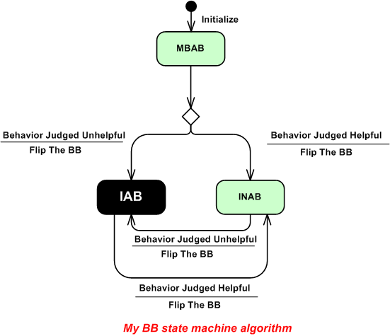 As the state machine below shows, I’m flexible in that my initial judgment may change. However, once the BB transitions into the IAB state, I rarely decide to subsequently flip it into the INAB state; but I’m delighted when it does miraculously happen.