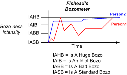 I first encountered the concept of the “Bozo bit” (BB) while reading a software engineering book penned by Jim McCarthy many years ago. The BB is a tri-state, enumerated attribute that can be used by immature people like BD00, but not you, to judge people. The BB’s 3 mutually exclusive states are defined as: