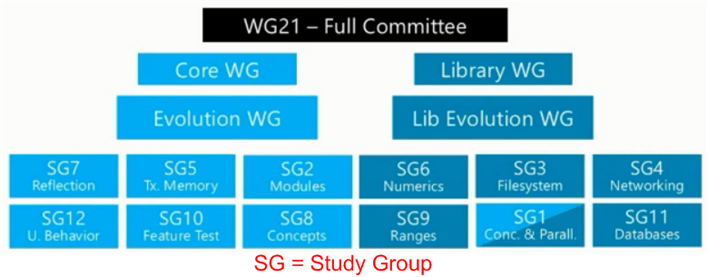 In his talk at the recently concluded GoingNative2013 C++ conference, Herb presented this slide to convey the structure of the ISO C++ Working Group 21 (WG21):