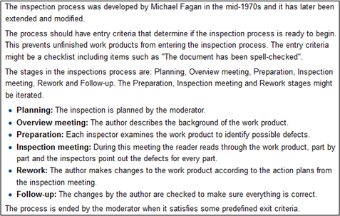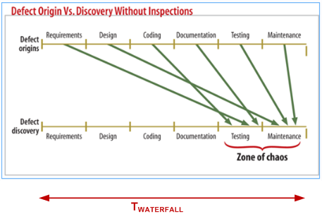 An agile-oriented alternative to boring and morale busting “Fagan-inspections-done-wrong” is shown below. The short, incremental delivery time frames get the product into the hands of internal and external non-developers early and often. As the system grows in functionality and value, users and independent testers can bang on the system, acquire knowledge/experience/insight, and expose bugs before they intertwine themselves deep into the organs of the product. Working hands-on with a product is more exhilarating and motivating than paging through documents and power points in zombie or contentious meetings, no?