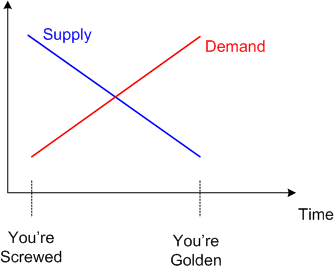 Be careful out there. If you acquire deep expertise and develop into a highly skilled worker in a narrow technical domain, you’re walking a tightrope.You may be highly valued by the marketplace today, but if your area of expertise becomes obsolete because of rapid technological change, your career may stall – or worse. On the other hand, if you luckily “choose” your narrow area of expertise correctly, your skillset may be in demand for life. It’s a classic textbook case of supply and demand.