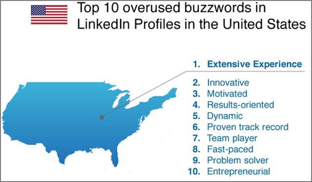 Check out this graphic that I borrowed from “LinkedIn Reveals the 10 Most Overused Job-Hunter Buzzwords“.