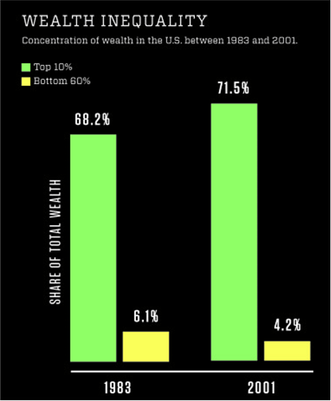 And though GDP has risen, wages have remained stagnant (except for those CEOs), which has contributed to the top 10% of the wealthiest Americans controlling nearly three-quarters of all the money in America.