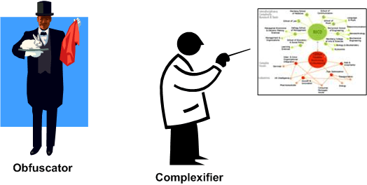 Since I’m pretty unsuccessful at it, one of my pet peeves is having to deal with obfuscators and complexifiers (OAC). People who chronically exhibit these behaviors serve as formidable obstacles to progress by preventing the right info from getting to the right people at the right time. “They” do so either because they’re innocently ignorant or because they’re purposefully trying to camouflage their lack of understanding on the topic of discussion for fear of “looking bad”. I have compassion for the former, but great disdain for the latter – blech!