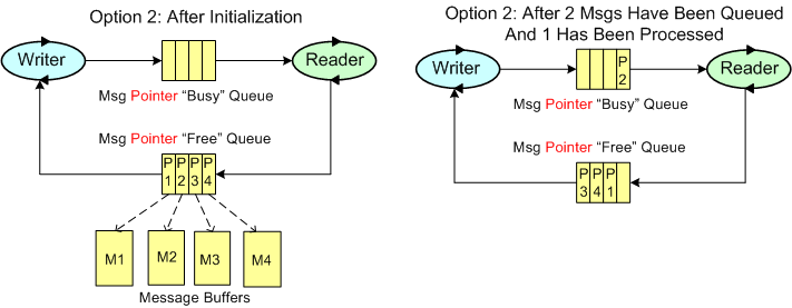 The figure below models a program in which a pipeline of worker threads communicate with each other via message passing. The accordion thingies ‘tween the threads are message queues that keep the threads loosely coupled and prevent message bursts from overwhelming downstream threads.