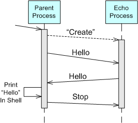 For example, take a look at the “bent” UML sequence diagram of the simple two process “echo” program below. When the parent process is launched by the user, it spawns an “Echo” process. The parent process then asynchronously sends a “Hello” message to the “Echo” process and suspends until it receives a copy of the “Hello” message back from the “Echo” process. Finally, the parent process prints “Hello” in the shell, sends a “Stop” message to the “Echo” process, and self-terminates. Of course, upon receiving the “Stop” message, the “Echo” process is required to self-terminate too.
