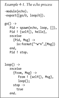- Send the “Hello” message to the “Echo” process (identified by the process ID bound to the “Pid” variable during the return from the spawn() function call) in the form of a tuple containing the parent’s process ID (returned from the call to self()) and the “hello” atom.