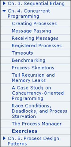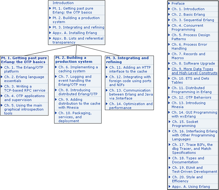 Currently, I’m in chapter 2 of the Erlang/OTP book (left TOC above) and chapter 6 in the Erlang book. As I lurch forward, the going gets slooower because the concepts and language features are getting more advanced. I hate when that happens. 🙂