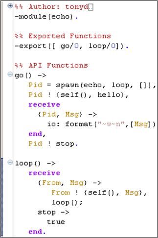 - If the received message is of type A), send a copy of the received Msg tuple argument back to the process whose ID was bound to the From variable upon message reception. In addition to the content of the Msg variable, the transmitted message will contain the loop() process ID returned from the call to self(). After sending the tuple, suspend again and wait for the next message (via the recursive call to loop()).