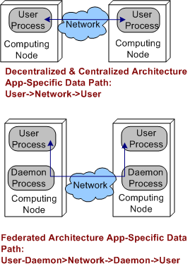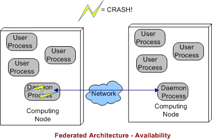 In a federated architecture, when a daemon process dies, a whole node and all the subscriber application user processes running on it are severed from communicating with the user processes running on the other nodes (see the sketch below) in the system. Thus, the federated architecture is “arguably” less fault tolerant than the decentralized and (as we’ll see) centralized architectures. However, through judicious “allocation” of user processes to nodes (the fewer the better – which sort of defeats the purpose of choosing a federation for per node intra-communication performance optimization), some work still may be able to get accomplished when a node’s daemon crashes.