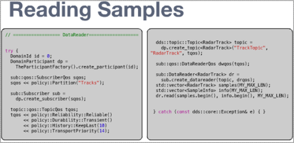 Even though the sample code shows non-blocking, synchronous send/receive usage, DDS, like any other communication service worth its salt, provides API support for blocked synchronous and asynchronous notification usage.