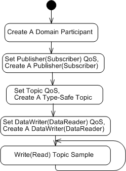 The UML activity diagram below illustrates the steps for setting up and sending (receiving) topic samples over DDS: define a domain; create a domain participant; create a QoS configured, domain-resident publisher (or subscriber); create a QoS configured and type-safe topic; create a QoS configured, publisher-resident, and topic-specific dataWriter; and then go!