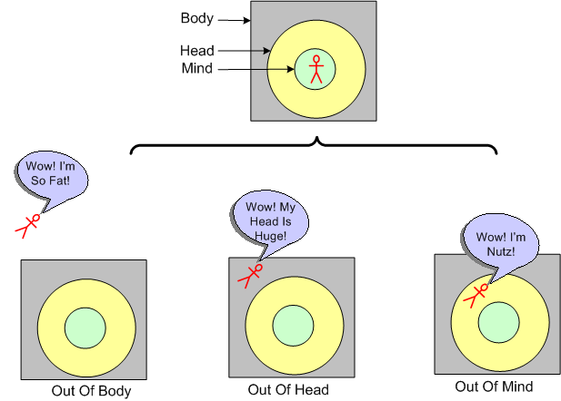 I’ve heard and read about people who’ve supposedly undergone “out of body” experiences. Hell, I haven’t even had an “out of head” experience, let alone a body-vacating one. Now, “out of mind” experiences are a different story. Those are where you remain in your head (so you’re still in your body) but not in your mind. In your body, in your head, out of your mind. Yepp, I’ve experienced several of those. As a matter of fact, I think I’ve been out of my mind ever since I started writing this stupid blog. Agree?