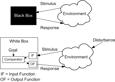 Note that in Bill’s model, there is an internal goal that determines the response to a given “disturbance“. Thus, given the same disturbance at two different points in time, the white box model can generate different responses whereas the black box model would always generate the same response.