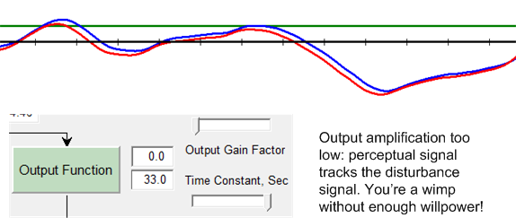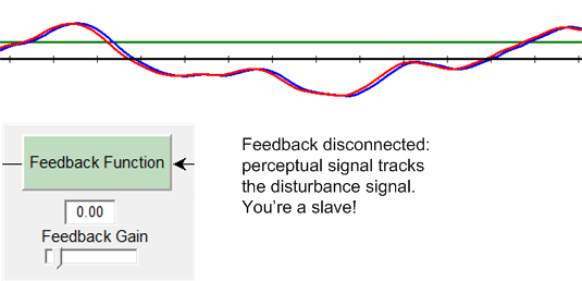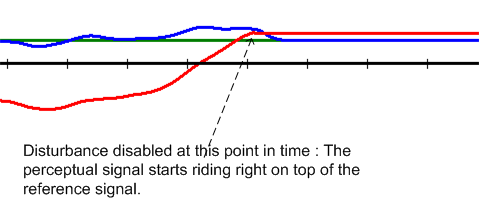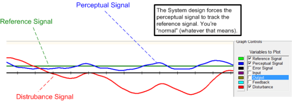 As you can see, while operating under stable, steady-state circumstances, the system does what it was designed to do. It purposefully and continuously changes its “observable” output behavior such that its internal (and thus, externally unobservable) perceptual signal tracks its internal reference signal (also externally unobservable) pretty closely – in spite of being continuously disturbed by “something on the outside“. When the external disturbance is turned off, the real-time trace goes flat; as expected. The perceptual signal starts tracking the reference signal dead nutz on the money such that the difference between it and the reference is negligible: