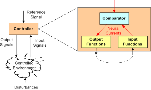 Notice that the comparator is one level removed from physical reality via the transformational input and output functions. An input function converts a physical effect into a simplified neural current representation and an output function does the opposite. Afterall, everything we sense and every action we perform is ultimately due to neural currents circulating through us and being interpreted as something important to us.