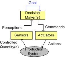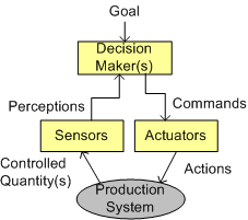 Given 1: a goal to achieve, and 2: the current perceived state of the production system, the decision-making apparatus issues commands it presumes will (in a timely fashion) narrow the gap between the desired goal and the current system state.