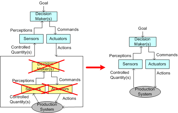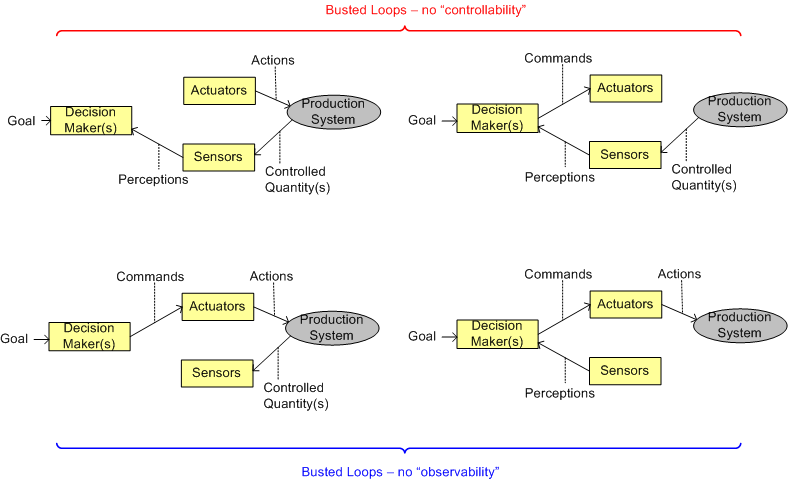 As the figure below illustrates, the capability of decision-makers to control and/or observe the functioning of the production system can be foiled by slicing through its loop of “consciousness” at numerous points in the system.