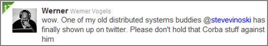 Werner Vogels is Amazon.com’s Chief Technology Officer and author of the blog “All Things Distributed – Building Scalable And Robust Distributed Systems“. I just couldn’t stop myself from laughing when he announced that fellow distributed-systems guru Steve Vinoski had just joined Twitter: