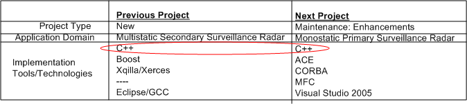 The table below shows the software technologies embedded within each of the products. Note that the only common attribute in the table is C++, which, thank god, I’m very proficient at. Since ACE, CORBA, and MFC have big, complicated, “funky” APIs with steep learning curves, it’s a good thing that “training” time is covered in the schedule as required by our people-centric process. π