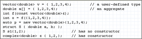 We can use the {…} notation for every initialization and wherever we initialize an X with {v} we get the same resulting value. That’s a major improvement over C++98’s non-uniform set of alternatives using the =v, ={v}, and (v) notations: