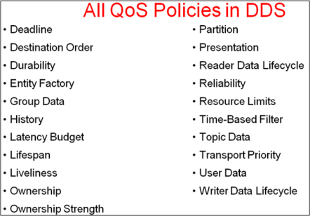 Unlike MCPS MW, DCPS MW supports being “told” by the app tier pub-sub components which Quality Of Service (QoS) parameters are important to each of them. For example, a publisher can “promise” to send topic samples at a minimum rate and/or whether it will use a best-effort UDP-like or reliable TCP-like protocol for transport. On the receive side, a subscriber can tell the MW that it only wants to see every third topic sample and/or only those samples in which certain data-field-filtering criteria are met. DCPS MW technologies like DDS support a rich set of QoS parameters that are usually hard-coded and frozen into MCPS MW – if they’re supported at all.