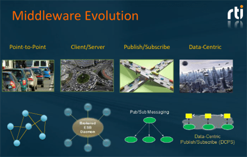 The slide below, plagiarized from a recent webinar presented by RTI Inc’s CEO Stan Schneider, shows the evolution of distributed system middleware over the years.