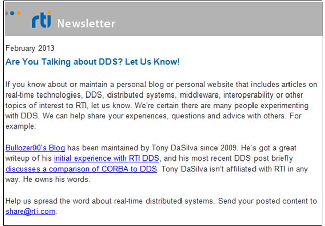 The VP of marketing at RTI, Dave Barnett, published a short video showing that the demo was a success: DDS Interoperability Demo. Since I’m a distributed, real-time software developer geek, this stuff makes me giddy with enthusiasm. Sad, no?