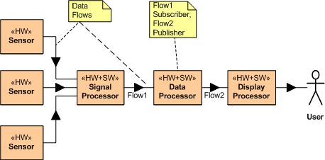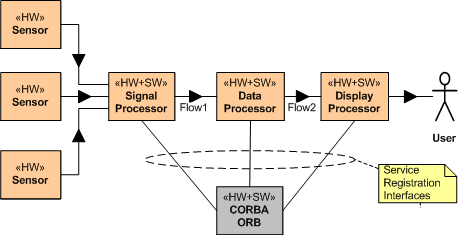 Consider the example distributed, data-centric, sensor system application layer design below. If this application sits on top of a DDS middleware layer, there is no “intrusion” of a (single point of failure) CORBA broker into the application layer. Each application layer system component simply boots up, subscribes to the topic (message) streams it needs, starts crunching them with it’s app-specific algorithms, and publishes its own topic instances (messages) to the other system components that have subscribed to the topic.