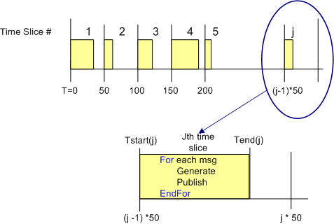 During runtime, the test app generates and publishes a stream of “canned” messages at a user specified rate and for a user-defined test run duration. Upon the start of each time slice, the current time is “grabbed” and stored for later use. At the end of each tight, K-message, generate-and-publish loop, the end time is retrieved from the OS and then the percent CPU load for the slice is calculated in accordance with the simple equations below. At the end of the test run, the first 1000 sample points are averaged, and the result, along with the max and min loads measured during the run are printed to the console and a date stamped log file.