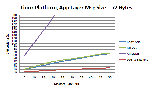 Transmit batching, along with a whole bevy of “free” (to application layer programmers) tunable features in RTI’s DDS, consists of aggregating a bunch of application layer messages into one network packet to increase the throughput (at the expense of increased latency). Since batching isn’t available in AMQ JMS or our “homegrown” Boost.Asio comm layer candidate, only the DDS performance increase is shown on the graph.
