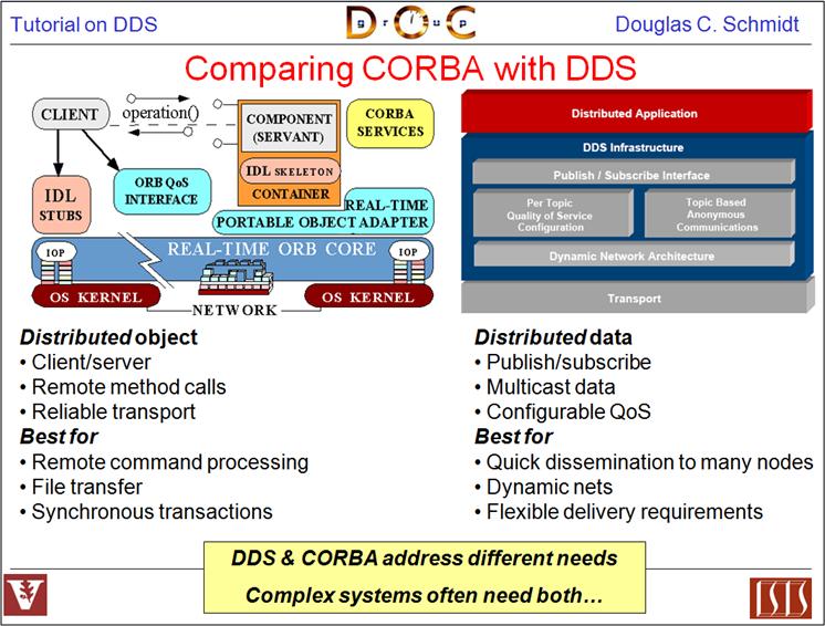 I recently dug up an old DDS tutorial pitch by distributed system middleware expert extraordinaire, Doug Schmidt. The last slide in the pitch shows a side-by-side, high-level feature comparison of CORBA and DDS: