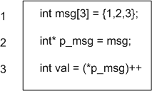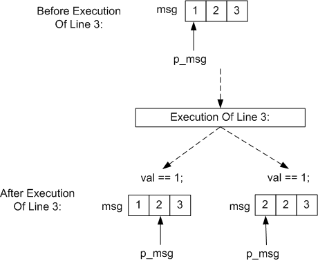 Changing the third line to “int val = *p_msg++” solved the problem. Because of the operator precedence rules, the new behavior is what was originally intended: