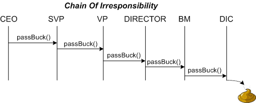 As you might surmise, the world of hierarchical superiority has an analogous pattern, err anti-pattern, named “Chain Of Irresponsibility“. Do ya think I need to add words to explain the inter-object collaborations for this pattern as shown in the UML sequence diagram that follows?