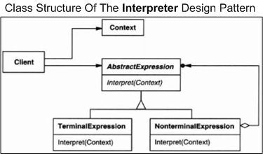 Moving on, observe the copied-and-pasted pseudo-UML class diagram of the GoF Interpreter design pattern below. In a nutshell, the “client” object builds and initializes the context of the sentence to be interpreted and invokes the interpret() operation – passing a reference to the context (in the form of a syntax tree) down into the concrete “xxxExpression” interpreter objects in a recursive descent so that they can do their piece of the interpretation work and then propagate the results back up the stack.
