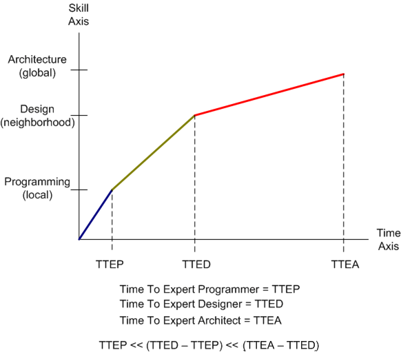 Check out the graph below. It is a totally made up (cuz I like to make things up) fabrication of the relationship between software skill acquisition and time (tic-toc, tic-toc). The y-axis “models” a simplistic three skill breakdown of technical software skills: programming (in-the-very-small) , design (in-the-small) and architecture (in-the-large). The x-axis depicts time and the slopes of the line segments are intended to convey the qualitative level of difficulty in transitioning from one area of expertise into the next higher one in the perceived value-added chain. Notice that the slopes decrease with each transition; which indicates that it’s tougher to achieve the next level of expertise than it was to achieve the previous level of expertise.