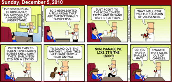 …you can have a Dilbertonian conversation with a BM (past or present) like the one below without getting fired? Of course, the elegant genius of Dilbert is that former cubicle-dweller-turned-gazillionaire Scott Adams makes you want to laugh and cry simultaneously.