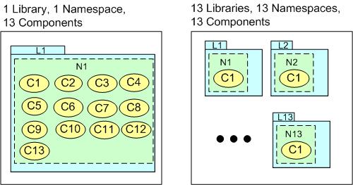 Given a set of static or evolving requirements, how should one allocate components to namespaces and libraries? The figure below shows extreme 1/1/13 and 13/13/13 cases for our hypothetical 13 component example.