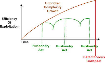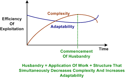 If the execution of husbandry is boldly done right (and it’s a big IF for humongous institutions with a voracious appetite for resources), an effectively self-controlled and adaptable production system will emerge. Over time, and with sustained periodic acts of husbandry to reduce complexity, the system can prosper for the long haul as shown in the figure below.