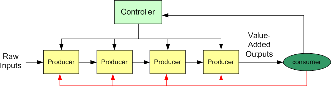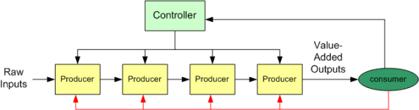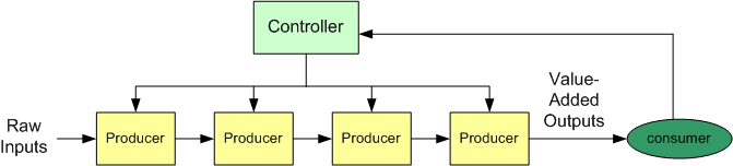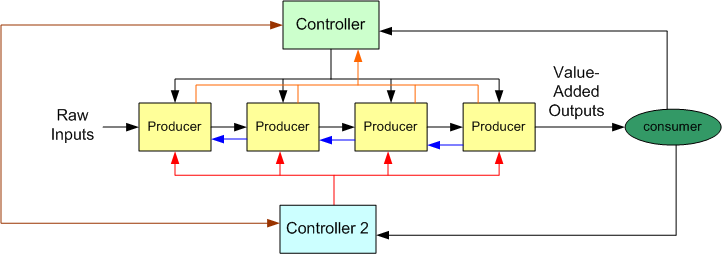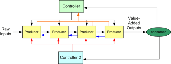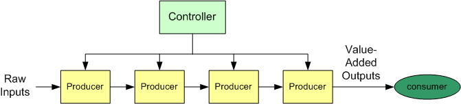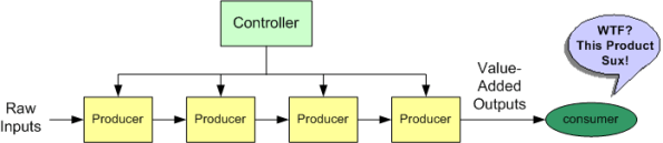 Let’s say that you come up with a great product idea that is both wanted and needed by a large market (ka-ching!). Let’s also say that your product is non-trivial and it requires specialized expertise to produce it from raw inputs to its value-added end state. After mustering up enough courage and scrounging up enough money, you become an entrepreneur – whoo hoo! So, you design the system below, hire the expertise you need, and kick off the enterprise. Of course, you rightly put yourself in the controller position and serve as the system coordinator.