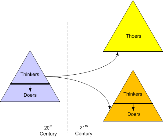 During the rise of the “institution” in the 1900s, Taylorism produced the segregated thinkers/doers model of operation (as shown on the left in the figure below) in order to get things done. Most doers were uneducated and assumed to be lazy/unmotivated barbarians.The “superior” thinkers created the framework of how/what/when work was done; hired some doers; tightly monitored and controlled the process of production.