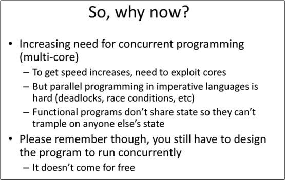 In one of her last viewgraphs (see below), Ms. Parsons addressed the main reason for the rise of functional programming languages. Being a specifier/designer/developer of distributed real-time sensor systems, I’m really keen on her first bullet.