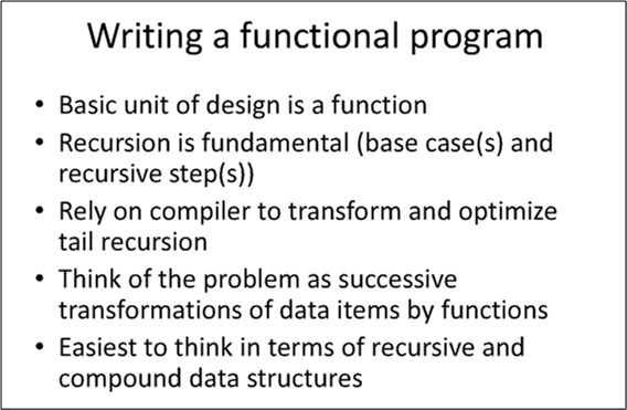 One of Rebecca’s opening foils is shown below. As opposed to a statement, which is the fundamental unit of design in imperative languages, the pure “function” is ground zero in the functional language world. Recursion and statelessness are fundamental tenets of functional languages. Problems, even those that are naturally stateful (most real-world problems?), must be morphed into the vocabulary and semantics of functional language land.