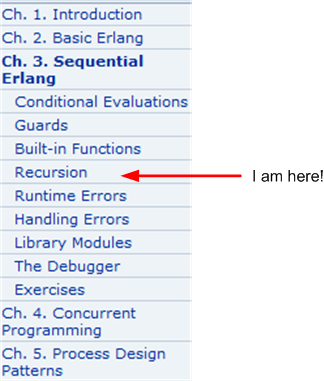 The blue arrow is my sore spot. You see, I’ve been programming imperatively in FORTAN, then C, and then C++, since Jesus was born. Thus, learning the stateless, recursive, functional programming mindset that Erlang is founded upon is a huge hurdle for me to overcome. Nevertheless, as I’ve stated before, I’m half-assedly trying to learn OMOT how to program in Erlang with the aid of this very good book:
